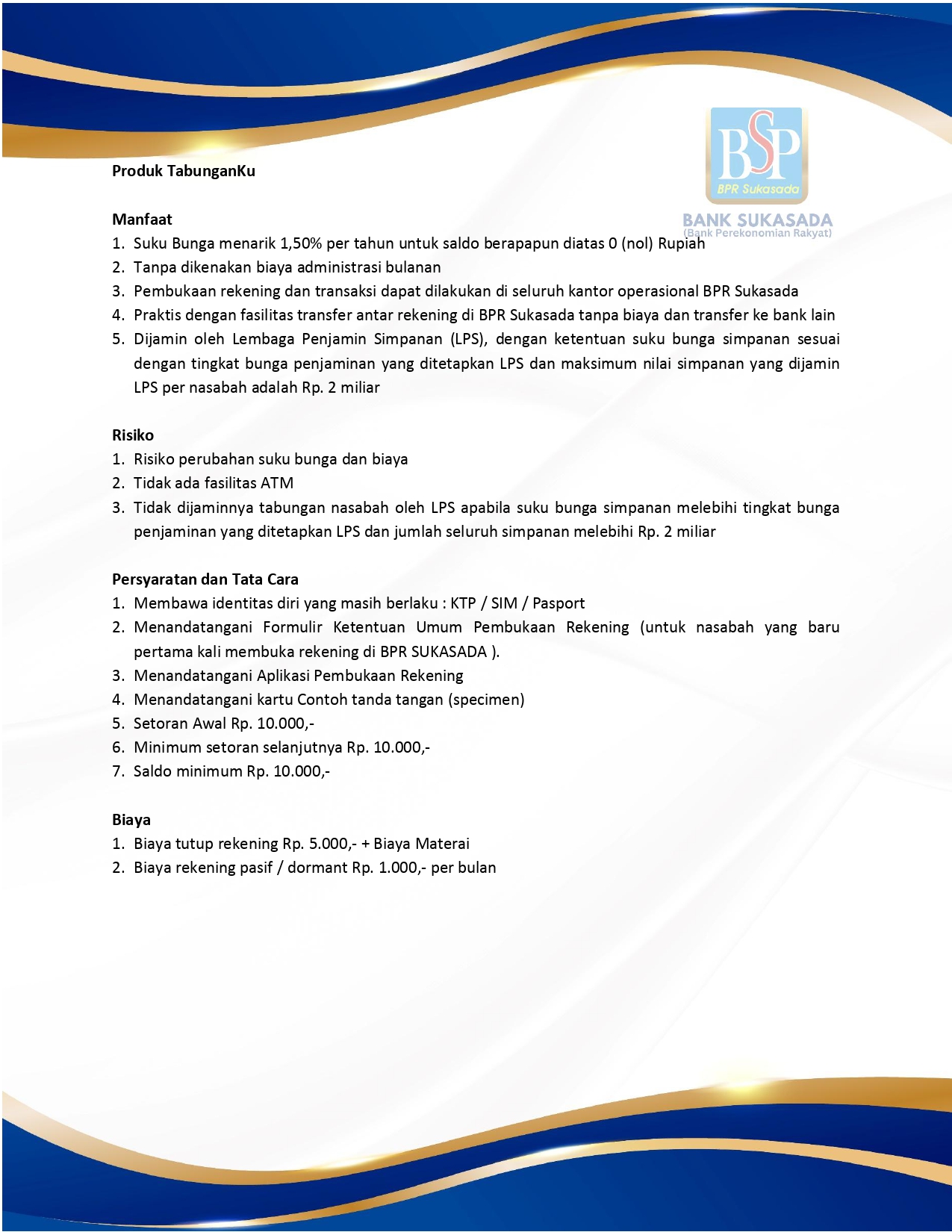 Visi : Menjadikan BPR SUKASADA, Terpercaya pilihan mitra usaha. Misi : • Mewujudkan pertumbuhan dan keuntungan yang berkesinambungan. • Mengupayakan penghimpunan dana dan penyaluran pembiayaan pada segmen UMKM. • Merekrut dan mengembangkan pegawai professional dalam lingkaran kerja yang sehat. • Menyelenggarakan operasional bank sesuai standar perbankan yang sehat. Tujuan : BPR SUKASADA Palembang, bertujuan untuk mendayagunakan sumber dana yang tersedia baginya unutk meningkatkan kesejahteraan masyarakat dan menghasilkan keuntungan yang cukup untuk mempertahankan kesinambungannya.